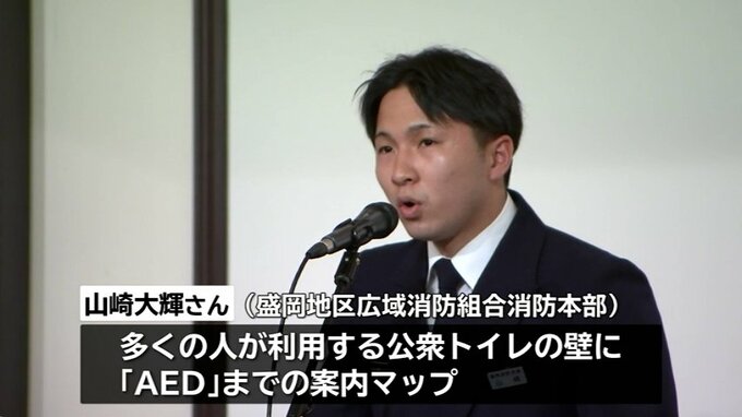 このうち、盛岡地区広域消防組合消防本部の山崎大輝さんは、多くの人が利用する公衆トイレの壁に「AED」までの案内マップを貼ることで、いざというときに見つけることができるというアイデアを提案しました。