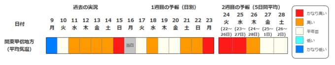 関東甲信地方の向こう2週間の気温は、寒気の影響を受けにくく暖かい空気が流れ込みやすい時期があるため平年並か高く、22日頃からはかなり高くなる見込みです。