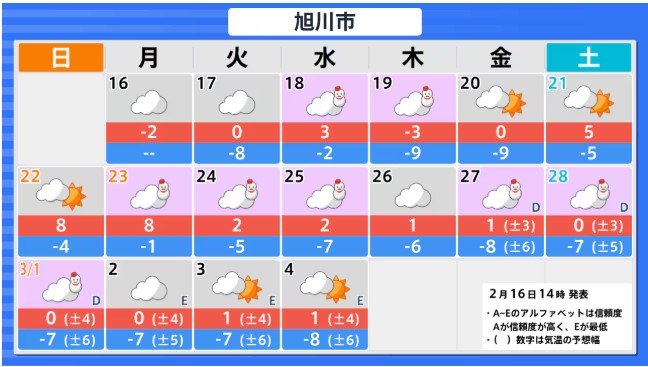 北海道地方の向こう2週間の気温は、寒気の影響を受けにくく暖かい空気が流れ込みやすい時期があるため高い日が多く、21日頃からはかなり高くなる見込みです。農作物の管理等に注意してください。積雪の多い地域ではなだれに注意してください。