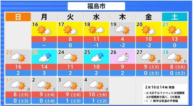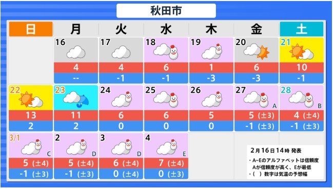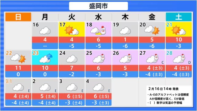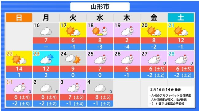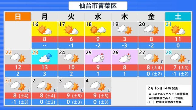 東北地方の向こう2週間の気温は、寒気の影響を受けにくく暖かい空気が流れ込みやすい時期があるため平年並か高い日が多く、22日頃からはかなり高くなる見込みです。農作物の管理等に注意してください。積雪の多い地域ではなだれに注意し