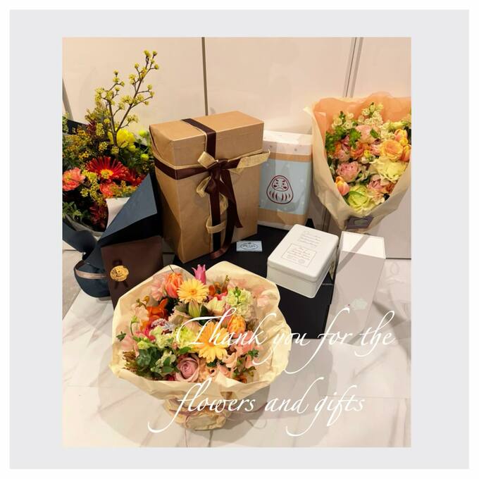 また別の写真では、「Thank you for the flowers and gifts」と綴り、ピンクやオレンジの花々が彩る豪華な花束や、丁寧にラッピングされたプレゼントの数々も紹介。