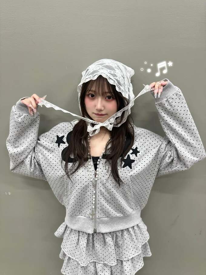 ドット柄にフリルがたっぷりあしらわれたキュートなパーカーに、まるで赤ちゃんのようなレースのヘッドドレスを着用し、にっこり微笑むキュートな希空さんの姿を投稿しています。