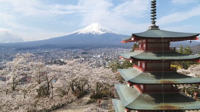 大勢の観光客でにぎわう富士吉田市の新倉山浅間公園は、春になると富士山と五重塔、それに満開の桜を写真に収めようと、許容量を超えるほどの観光客が訪れます。