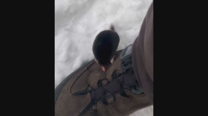 「目の前から歩いてきたので何かなと見たらもぐらでした。足を何かと勘違いしたのか、温かいのか黒いから地面と思ったのか、すごいすり寄ってきました。雪の上では初めてだったのでびっくりしました」