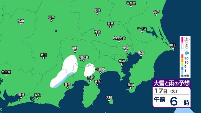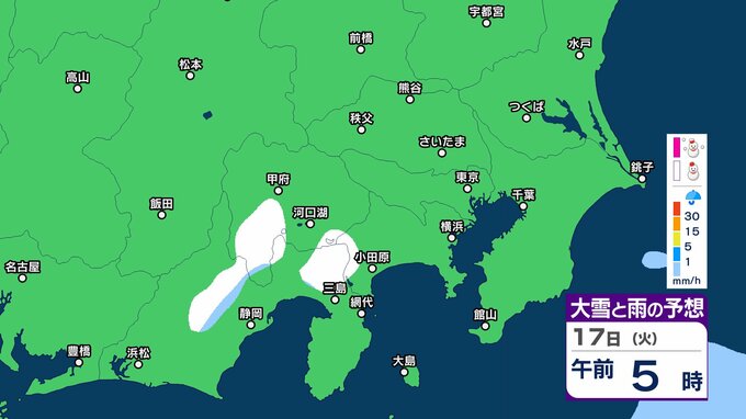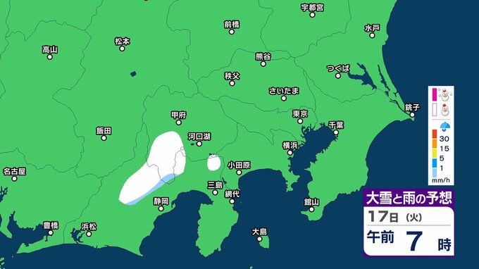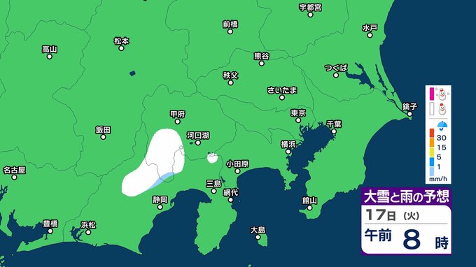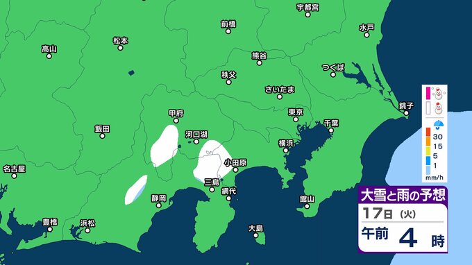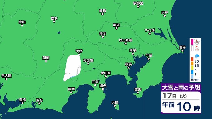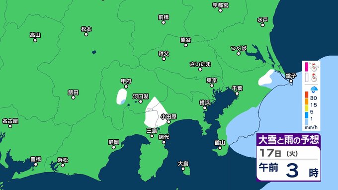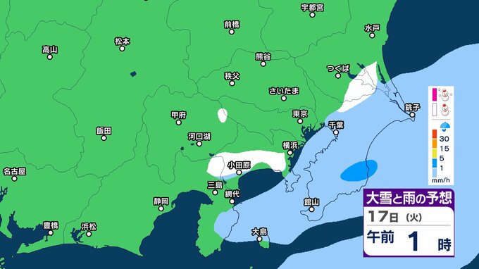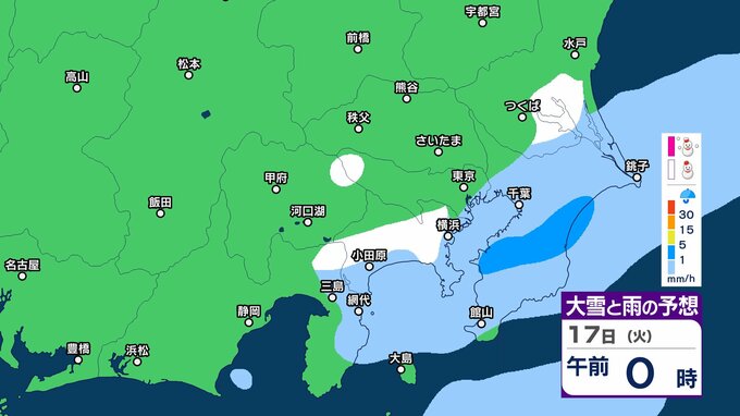 【また雪?予想】東京・栃木・群馬・埼玉・茨城・千葉・神奈川・長野・山梨 16日(月)~19日(木)1時間ごとの雪雨シミュレーション 神奈川県では1~5センチの降雪予想【気象庁/16日午後5時更新】 RSK山陽放送 2026年2月16日(月) 17:26 国内 17日(火) 気象庁によりますと、あす(17日)は、高気圧に覆われますが、気圧の谷や湿った空気の影響を受ける見込みです。このため、曇りや晴れで、雨や雪の降る所があるということです。 16日(月)~19日(木)1時間ごとの雪と雨のシミュレーション 【画像】16日(月)~19日(木)1時間ごとの雪と雨のシミュレーション