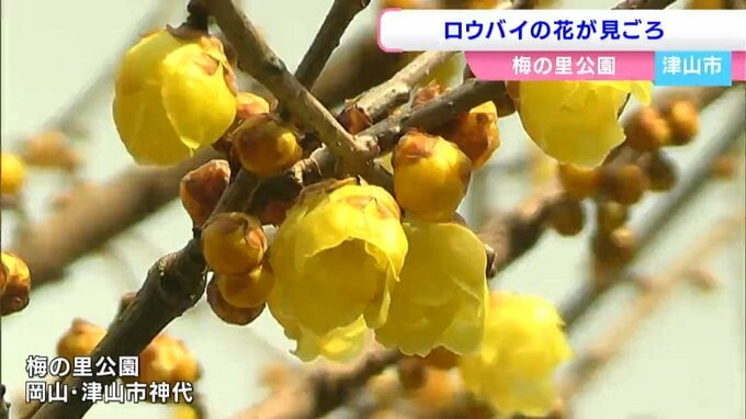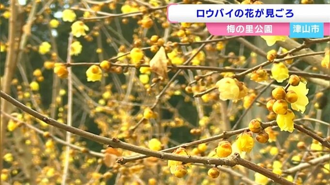 梅の名所として知られる津山市の梅の里公園では約60本のロウバイが開花のピークを迎えています。