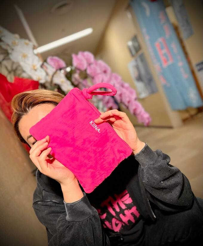 KIINA.とあしらわれたピンクのポーチから顔を覗かせるかわいらしいショットや、逆に顔を隠してしまうお茶目なショットなどを披露しています。