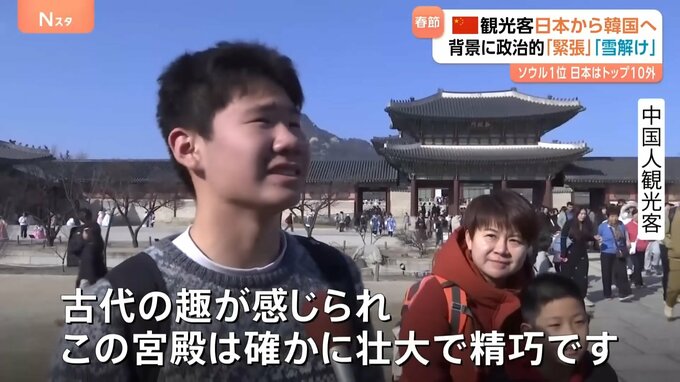 観光客がまず向かったのは、ソウルのシンボル・景福宮。旧正月には無料開放されていて、多くの中国人観光客が歴史遺産を堪能しました。