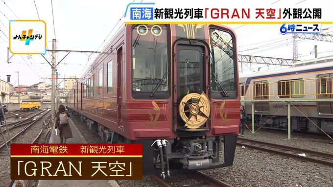 南海電鉄が大阪と世界遺産「高野山」を結ぶ新たな観光列車を公開しました。 南海電鉄の新たな観光列車「GRAN天空」。真っ赤な車体にゴールドを基調としたデザインが施されていて、沿線の高野山に咲くシャクナ…
