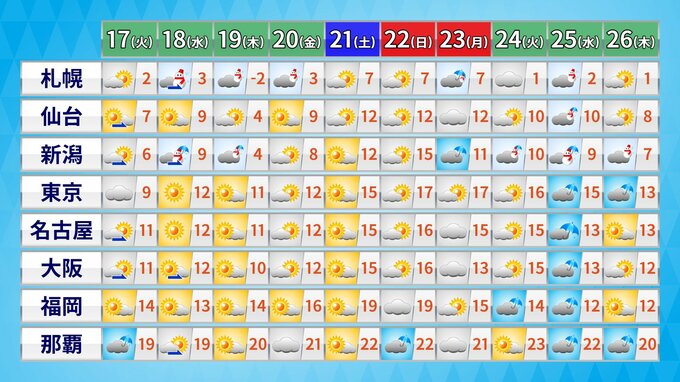 各地の早期天候情報と、2週間気温予報は次のとおりです。