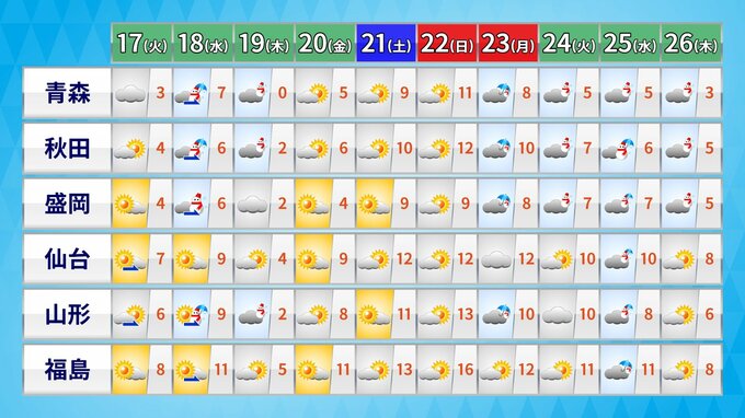 東北地方の向こう2週間の気温は、寒気の影響を受けにくく暖かい空気が