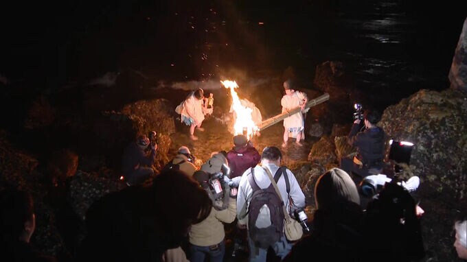 関門海峡を望む北九州市門司区の和布刈神社では、17日午前2時半ごろ、大きな松明の明かりを頼りに、3人の神職が海に入り、岩に付いたわかめを鎌で刈り取りました。
