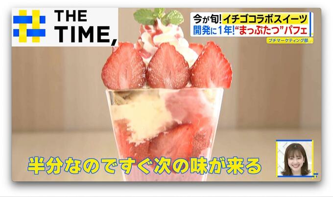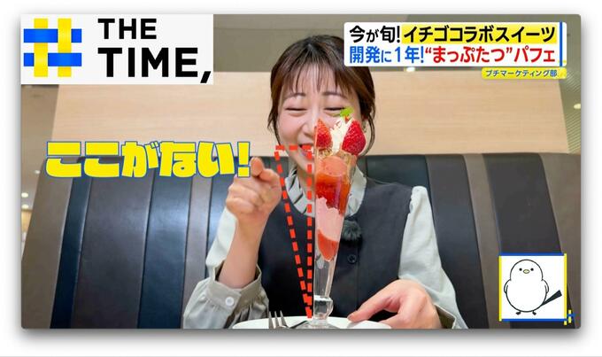 グラスはタテに半分にしたような特殊な形で、イチゴもタテ半分。まさにパフェを“まっぷたつ”にしたような見た目です。いったいナゼ?