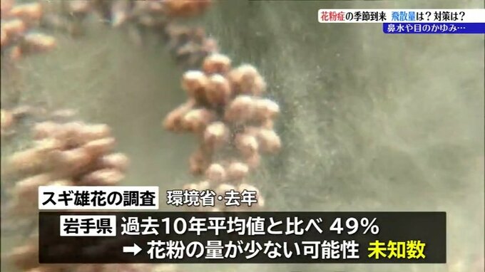 環境省が毎年調査しているスギ花粉のもととなる雄花の咲き具合について、直近2025年の調査で岩手県は過去10年の平均値の49%半分以下だったことから、花粉の量が少ないという可能性もあり2026年は未知数です。