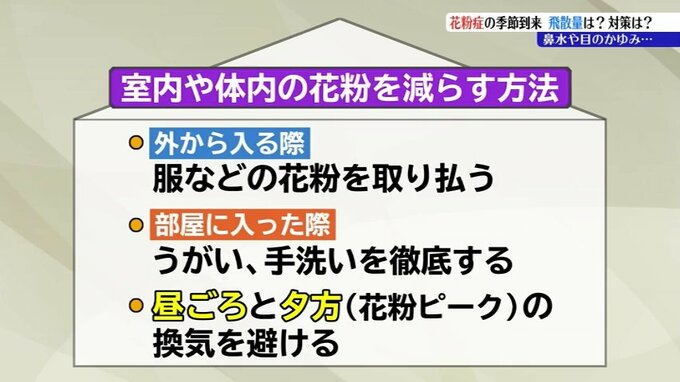 また1日の中で花粉の飛ぶピークと言われる、昼頃と夕方の換気を避けることも効果的です。