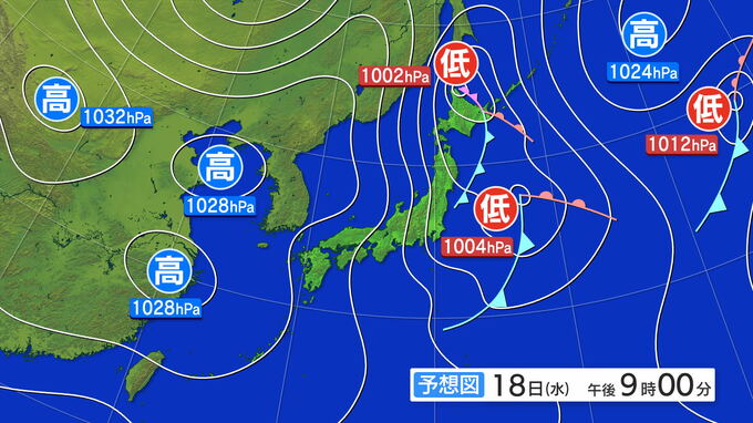 18日午後9時の予想天気図では、低気圧は発達しながら北海道付近へと進む込みです。