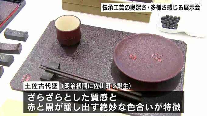 県内の職人13人が所属する「県伝承工芸協同組合」は、独自に発展してきた伝承工芸のすばらしさなどを知ってもらおうと、およそ20年前から、作品の展示会を開いています。こちらは、明治初期に佐川町で誕生した『土佐古代塗』。クルミの殻の粉末を使ったざらざらとした質感と、赤と黒が醸し出す絶妙な色合いが特徴です。