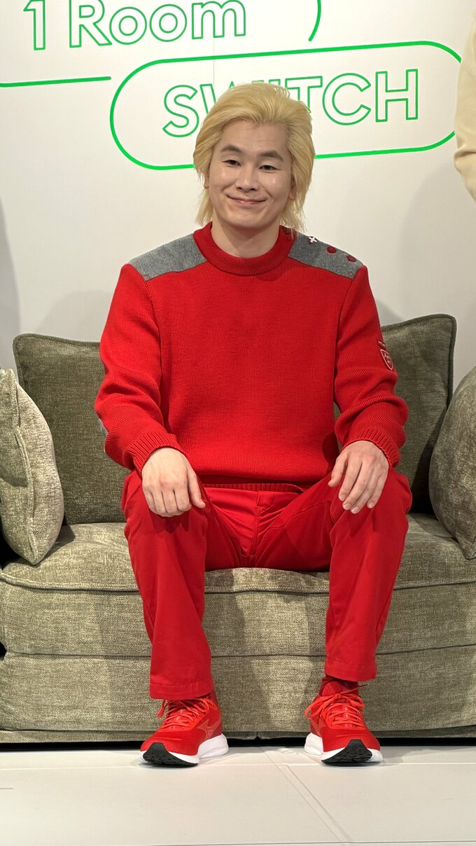 同社で〝スリパアンバサダー〟をつとめるカズレーザーさんは、トレードマークの真っ赤な部屋着を着用し、リラックススタイルで登場。