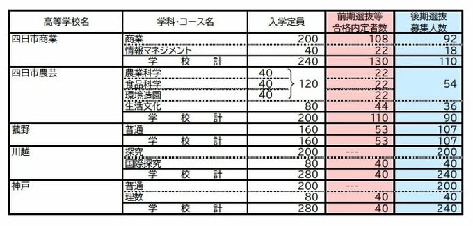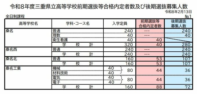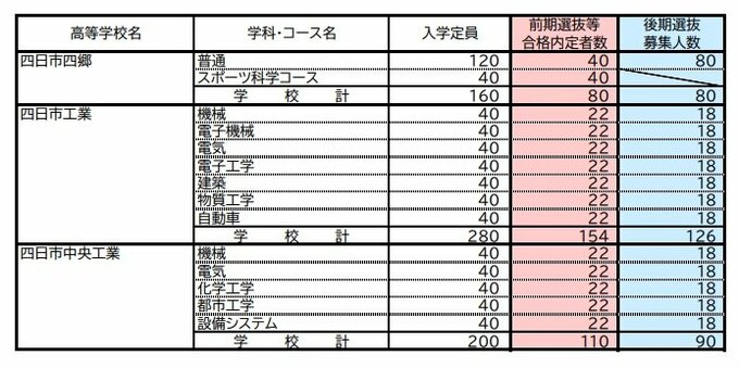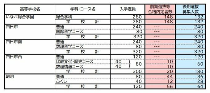 【三重県公立高校入試2026】前期選抜等の合格内定者数 後期選抜の募集人数 全日制課程では52校118学科・コースで実施 募集人員は6419人 令和8年度〈全校掲載・一覧〉 CBCテレビ 2026年2月17日(火) 13:21 国内 桑名・いなべ総合学園・四日市・四日市南など