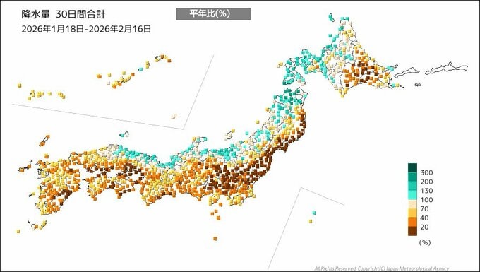 仙台管区気象台は17日午前、「東北地方太平洋側の少雨に関する東北地方気象情報 第1号」を発表しました。岩手県、宮城県、福島県では1月上旬から降水量の少ない状態が続いていて、この状態は今後も1か月程度は続く見込みだとして火の取り扱いに注意を呼びかける情報です。同様に少雨が続いていた関東地方は、建国記念の日の11日に低気圧などの影響で少し雨が降りましたが、東北太平洋側にはまとまった雨雲はかかりませんでした。16日までの30日間の降水量は、