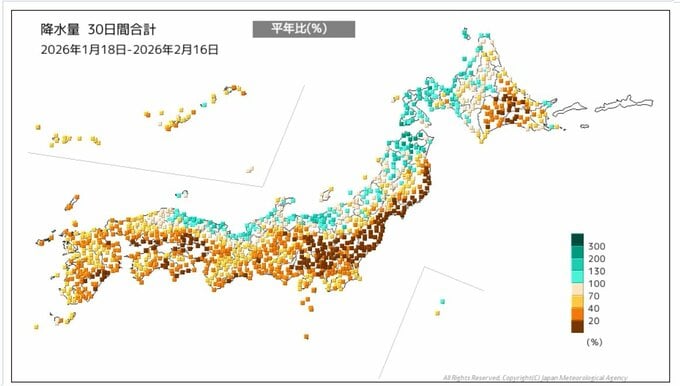 西日本の降水量(平年比) 統計開始以降1月として最も少雨に