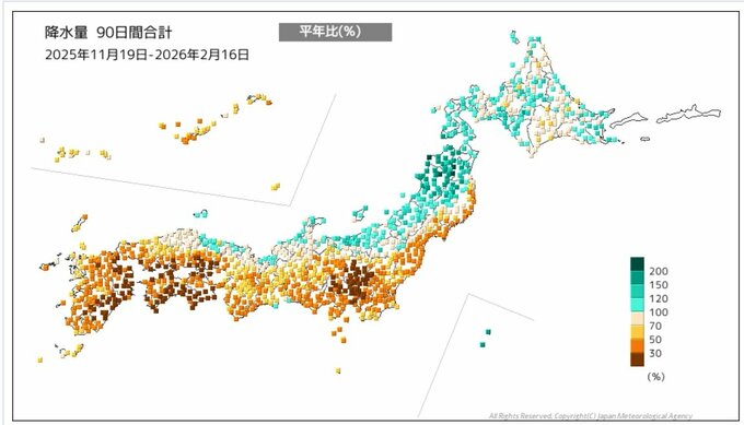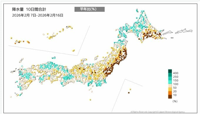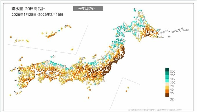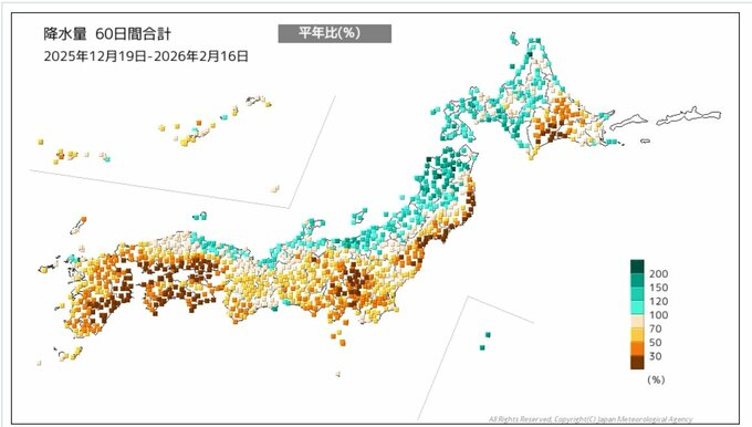 【列島カラカラ…】西日本と東日本太平洋側で降水量の少ない状態続く 統計開始以降1月として最も少雨となった地域も… 大阪で平年比51% 今後も少雨は続く見込み 水の管理や火の取り扱いに注意を 毎日放送 2026年2月17日(火) 15:33 国内 天気 【画像で見る】列島がカラカラ…降水量の合計を地図に照らし合わせると?