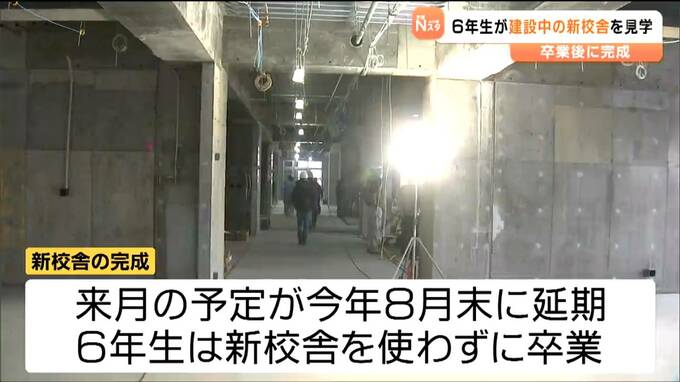新校舎の完成は3月の予定でしたが、地盤改良の影響で2026年8月末に延期となり、6年生は新校舎を使わずに卒業を迎えます。これを受け、工事を請け負った建設会社が見学会を開催し、6年生は、新しい校舎の姿を想像しながら最後の思い出作りを楽しみました。