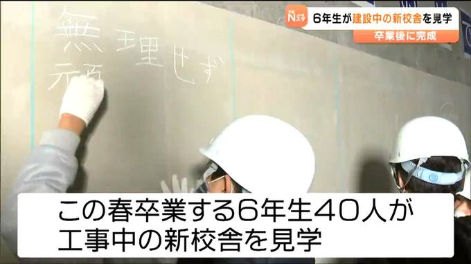 見学会が開かれたのは東松島市の大曲小学校です。17日はこの春卒業する6年生40人が工事中の新しい校舎の中に入りました。6年生は内装工事前のコンクリートの壁に在校生に向けたメッセージや将来の夢などを書き込みました。