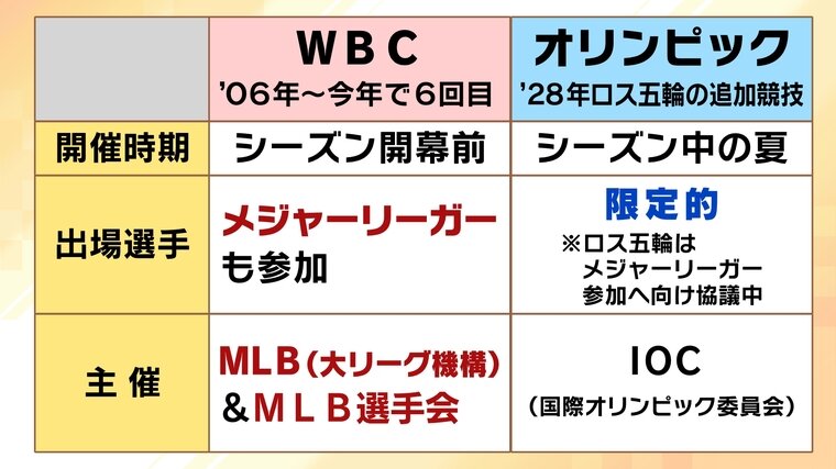 WBCは国内のシーズンの開幕前に行われるためトッププロの選手が参加可能ですが、オリンピックはシーズン中に大会があるため、参加が限定的となります。また、ロスオリンピックでは野球が追加競技として一度復活しますが、その後のオリンピックで正式競技となるかはまだわかりません。