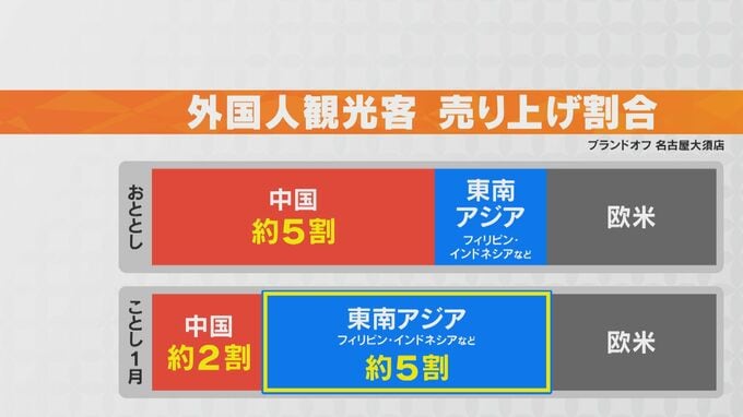 毎年、店の売り上げの約3割が外国人観光客によるもので、おととしまでは半分がを中国人観光客が占めていました。しかし先月は、その割合が2割に減少。一方で、東南アジアからの観光客による売り上げの割合が、半分に増えたと言います。