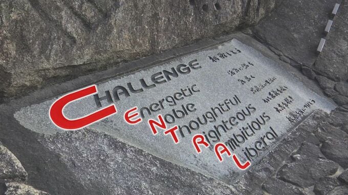 そこには、「CENTRAL(中央)」の頭文字をとった「CHALLENGE(挑戦)」「Energetic(活気ある)」「Noble(気高い)」「Thoughtful(思慮深い)」「Righteous(正しい)」「Ambitious(大志)」「Liberal(教養)」という7つのモットーが刻まれています。