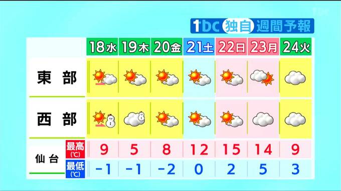 晴れや曇りの日が多いですが、西部では19日は雪が降るでしょう。19日は寒さが厳しくなりますが、その後は寒気が弱まり、日曜・月曜は4月上旬から中旬並みの暖かさとなりそうです。
