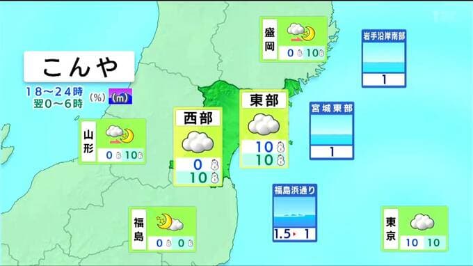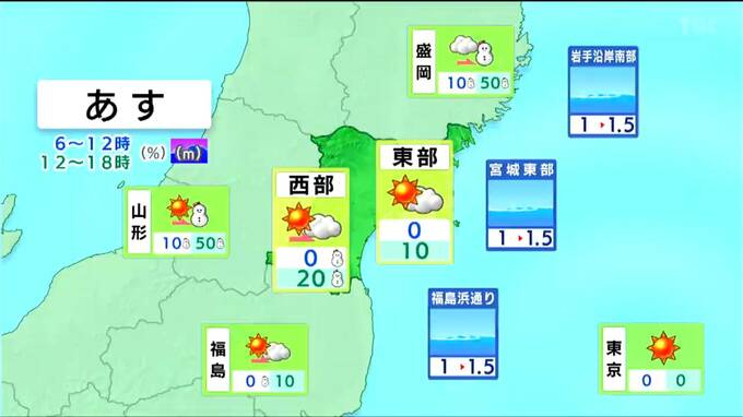 日中は各地とも晴れますが、夜は前線の影響で雲が広がり、西部を中心に雪が降るでしょう。東部では西寄りの風が強まり、夜遅くは海上で強風に注意が必要です。