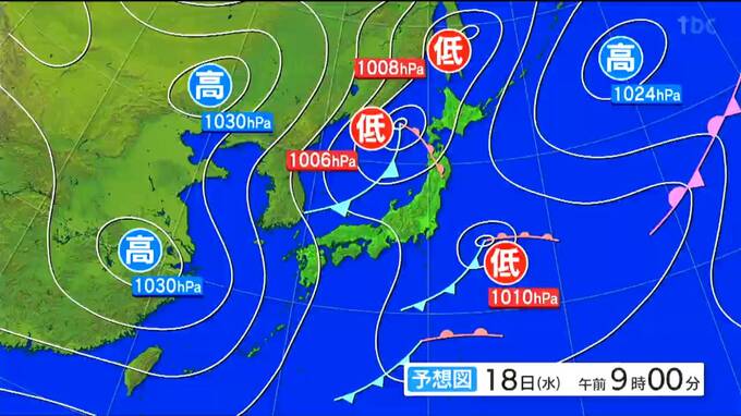 18日午前9時の予想天気図です。日本海北部に前線を伴った低気圧が進み、18日の午後にかけて発達しながら北日本を通過するでしょう。
