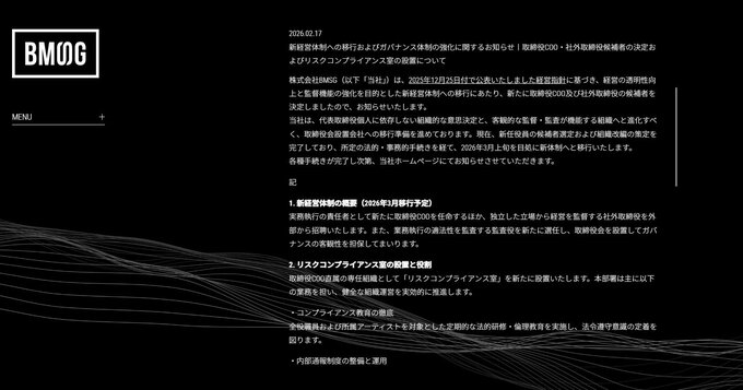 公式サイトでは「株式会社BMSG(以下「当社」)は、2025年12月25日付で公表いたしました経営指針に基づき、経営の透明性向上と監督機能の強化を目的とした新経営体制への移行にあたり、新たに取締役COO及び社外取締役の候補者を決定しましたので、お知らせいたします。」と、投稿。