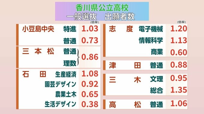 【2026年度】香川県公立高校「一般入試選抜 競争率」は?高松1.06倍・高松南(普通)1.59倍・坂出工(機械)1.80倍【30校全倍率掲載】 RSK山陽放送 2026年2月17日(火) 19:00 国内 高松、三木、津田、志度、石田、三本松、小豆島中央 【画像一覧】香川県公立高校 一般選抜出願者数 三本松は普通・理数ともに定員割れ、津田も定員割れとなっています。