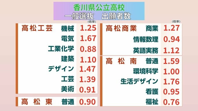 【2026年度】香川県公立高校「一般入試選抜 競争率」は?高松1.06倍・高松南(普通)1.59倍・坂出工(機械)1.80倍【30校全倍率掲載】 RSK山陽放送 2026年2月17日(火) 19:00 国内 高松工芸、高松商業、高松東、高松南 【画像一覧】香川県公立高校 一般選抜出願者数 高松工芸の電気・デザインは高倍率、高松南の普通も1.59倍と高倍率となっています。