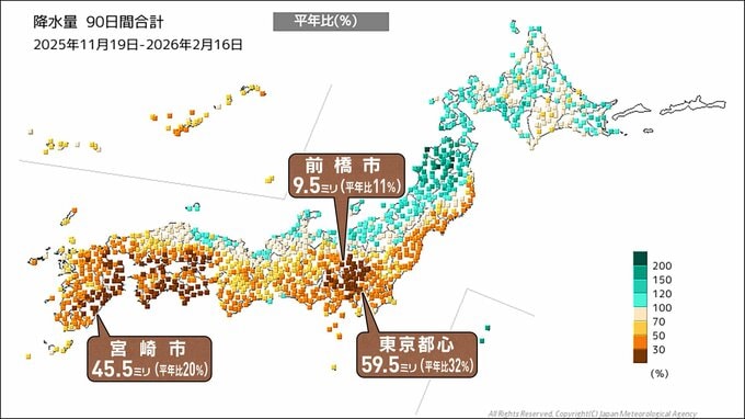 90日間降水量 西日本、東日本・北日本の太平洋側は「記録的な小雨」