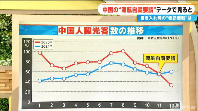 まずは、中国人観光客数の推移。2025年は1月からずっと2024年を上回っていましたが、11月に渡航自粛要請がありました。そこからトレンドが変わって、12月は半減しています。