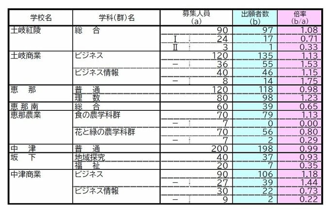 【確定版】岐阜県公立高校入試2026 出願状況・倍率 第一次・連携型選抜・通信制前期選抜の志願者数〈普通科〉岐阜1.09倍 大垣北1.09倍 岐阜北1.20倍 加納1.19倍 全校掲載・一覧(令和8年度) CBCテレビ 2026年2月17日(火) 18:32 国内 東濃・飛騨エリア(恵那・斐太・飛騨高山・益田清風など)の各校出願状況・倍率