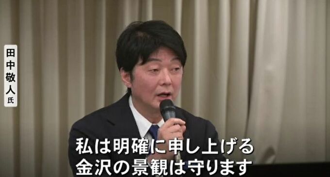 田中敬人氏「私は明確に申し上げる。金沢の景観は守ります。急務として金沢独自の景観基準。高さ規定は堅持する。駅周辺の方針については指定を受けた上で明確に高さ・容積率の制限を設け市民の理解の下で進めていく」