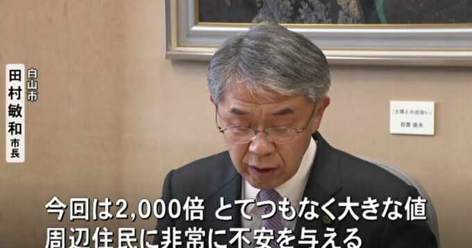 白山市役所・田村敏和市長「今回2000倍というとてつもなく大きな値ですので周辺住民に非常に不安を与える。上水道の水道は安全を確認しているが再度今もう一度確認をさせていただいている」
