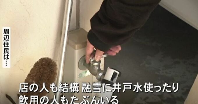 住民「まさかと思った。不安が第一なんじゃないか。全国版のテレビでもどこかの県でよくそういうの聞いて実際自分の体にどれだけそういう物質が含まれているか自分らで調べようがないから」「そうなんや今初めて聞きました。店の人もけっこう融雪に井戸水使ったり飲用の人もたぶんいる。(井戸水が)出るのであれば引いている人がいっぱいいると思うけど怖い。嫌や、飲みたくないと思う」