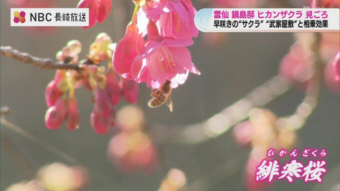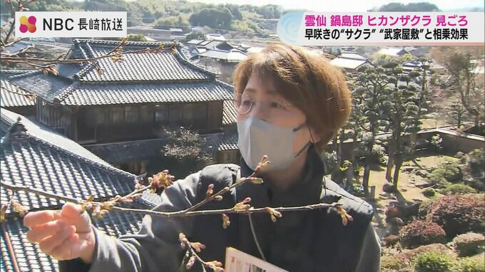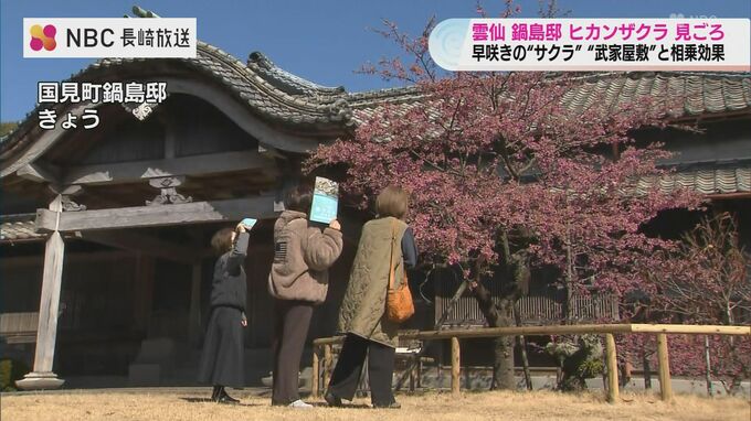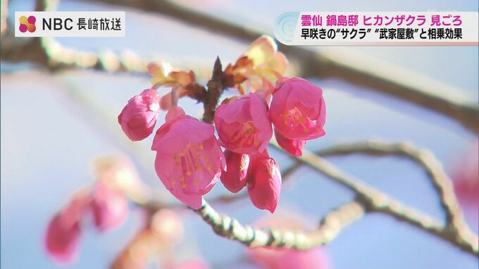 国の重要文化財にも指定されている雲仙市の鍋島邸で緋寒桜が咲き始め、間もなく見頃を迎えます。