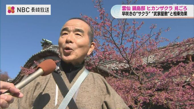 鍋島邸ガイド・今村正美さん「ここは相乗効果がありまして、建物と緋寒桜がお互いに生きてきます。武家屋敷にマッチします」