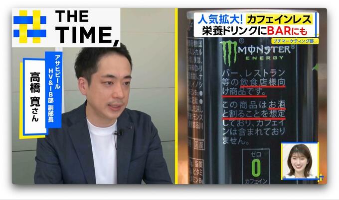 そこで、“お酒の飲み過ぎを防ぐ”ために、カフェインゼロのエナジードリンクを販売しているとのこと。