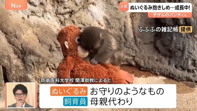 ニホンザルの子育てに詳しい防衛医科大学校の関澤麻伊沙助教によると、▼ぬいぐるみは『お守りのようなもの』で、▼飼育員さんは母親の代わりだということです。
