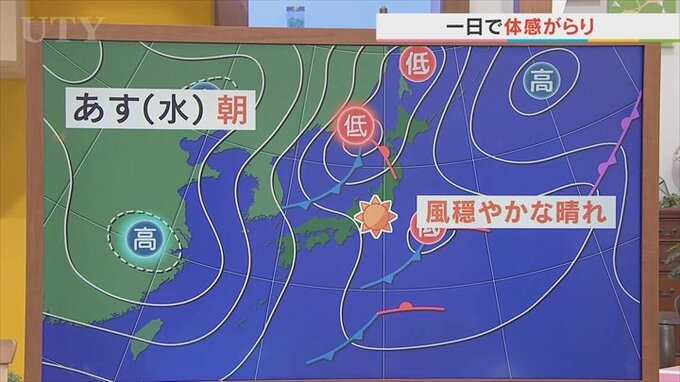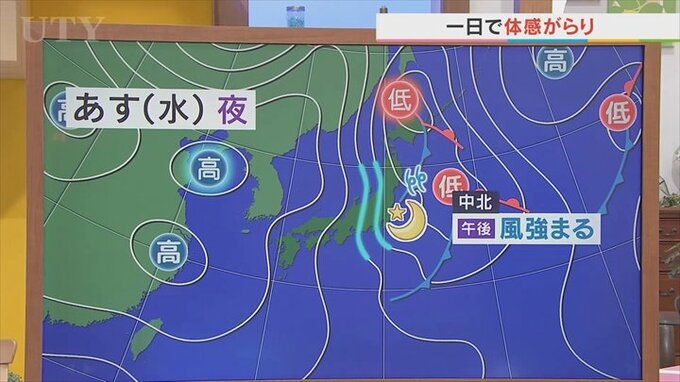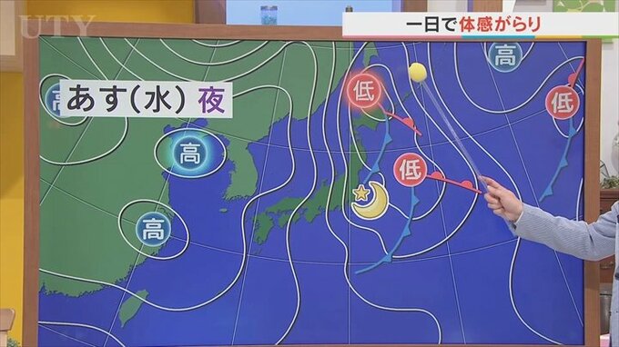 ただ、夜になりますとこの低気圧が北東方向へ進みまして、西に高気圧、東に低気圧の西高東低の気圧配置に変わってきます。