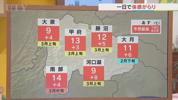 大月は6℃高い11℃で2月下旬並み。その他も4℃前後高くなる予想となっていまして、この時期としては高めの気温となりますが、風が強まるという点を考慮しなければいけません。