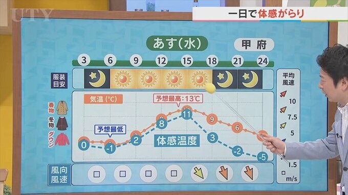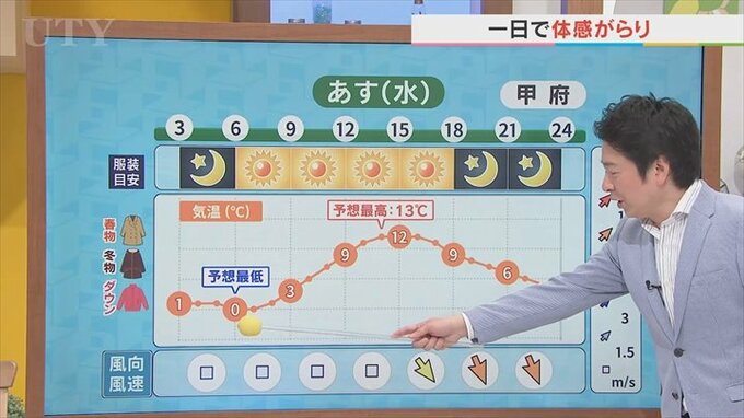 ところが夕方から風が強まる予想でして、特に夜は8m前後の風で、風速1mにつき体感温度は1℃変わると言われていますので、これを加味しますと夜は5℃を下回ってきます。ですので昼は日差しが暖かいんですが、夜は一気に寒くなりますので、お帰りが遅い方は風を通しにくい服装で暖かくしてお過ごしください。